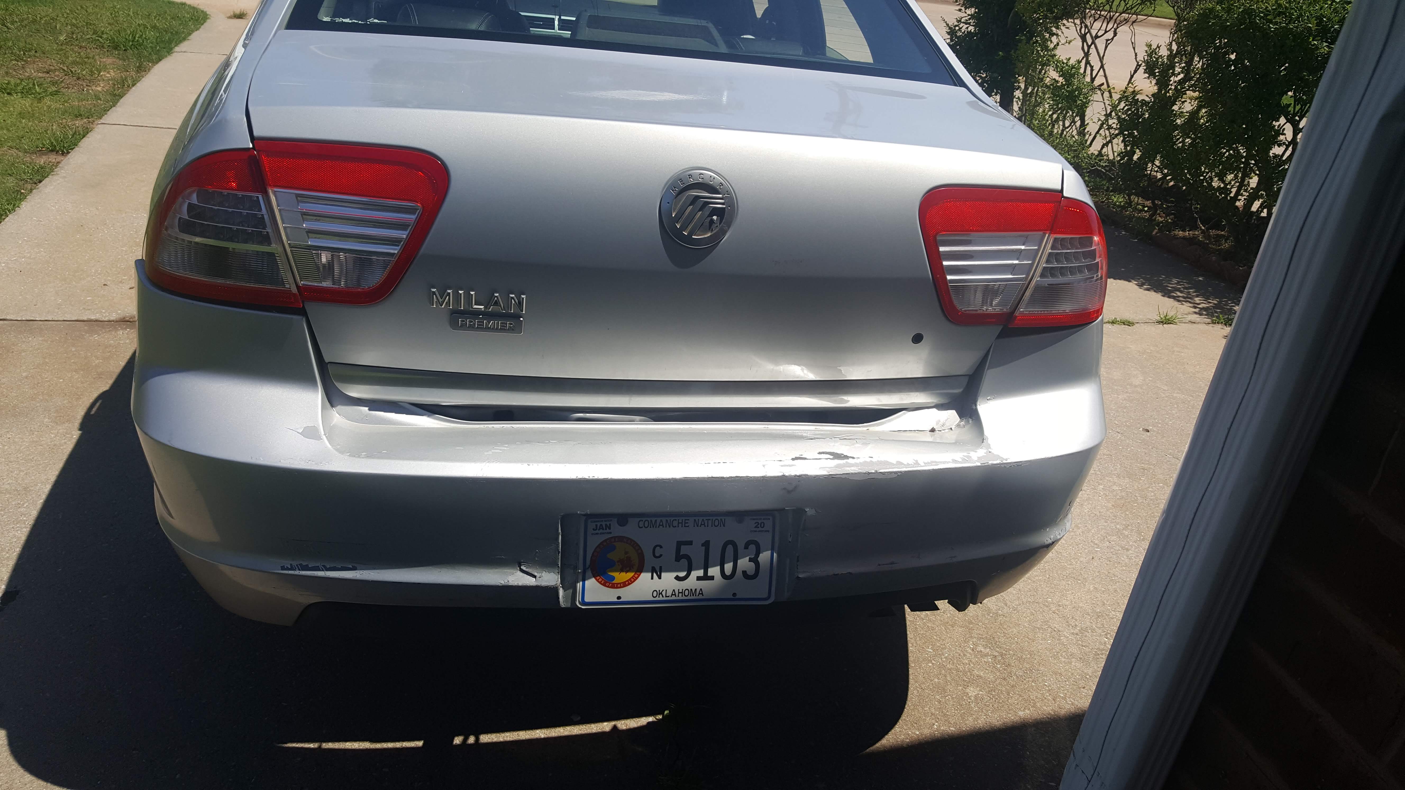 Silver Mercury Milan Premier with Comanche Nation Tribal Tags. Trunk is damaged. Bumper has been popped out.